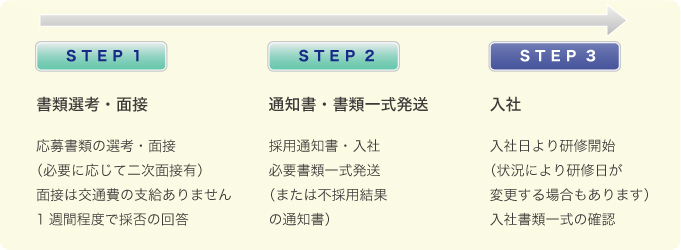 書類選考後、会社説明、面接の日時は追ってご連絡致します。